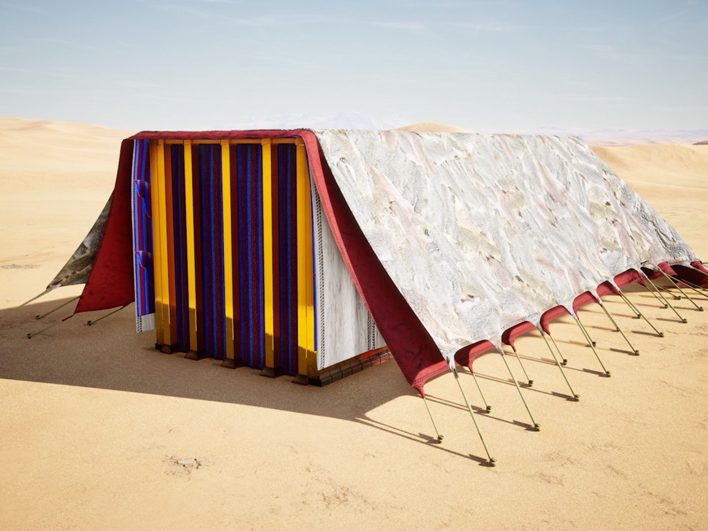 직육면체의 골격이 만들어지면 그 위에 천막을 둘러야 하는데, 그것은 열 폭의 천으로 지어야 한다. 각각의 천은 여러 가지 실로 정교하게 꼬아 만들되, 천 위에는 수를 놓아 그룹(천상계의 존재를 상징하는 가상의 동물) 형상을 새겨야 한다(1-6절). 그 위에 염소 털로 짠, 열한 폭의 천을 덮어야 하고(7-13절), 붉게 물들인 숫양 가죽과 돌고래 가죽으로 만든 덥개를 이중으로 만들어 씌워야 한다(14절).